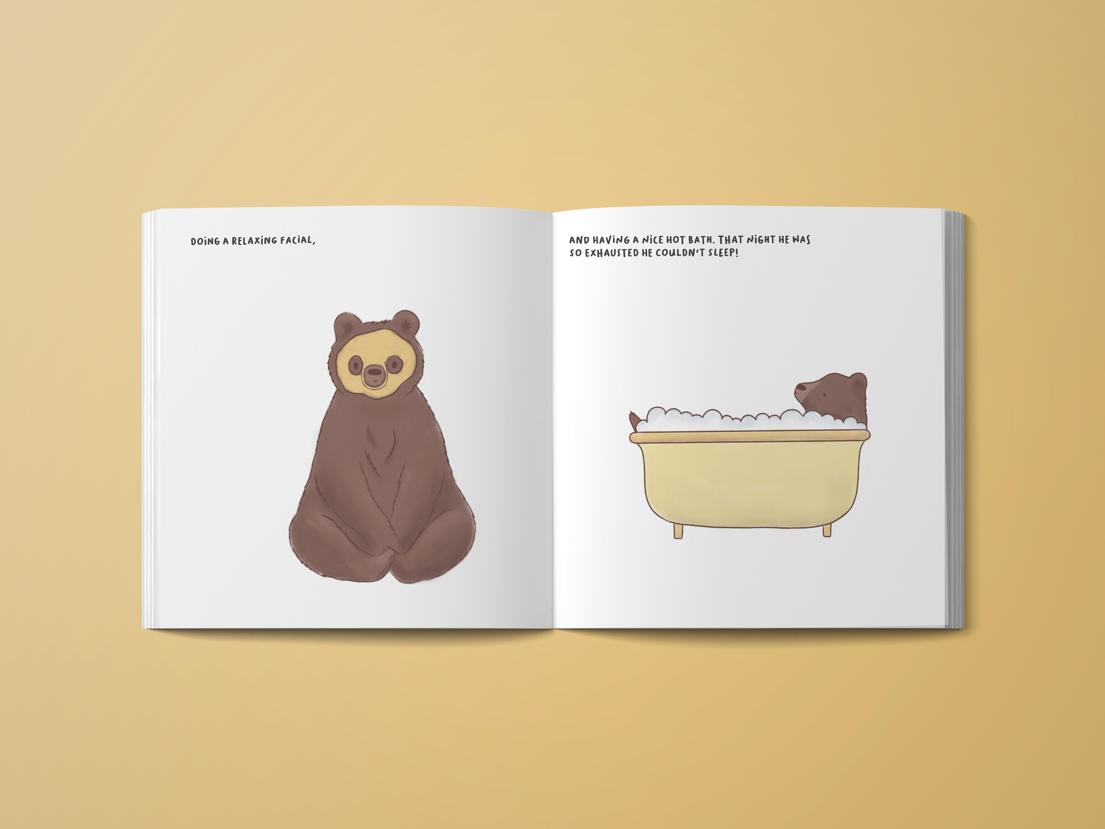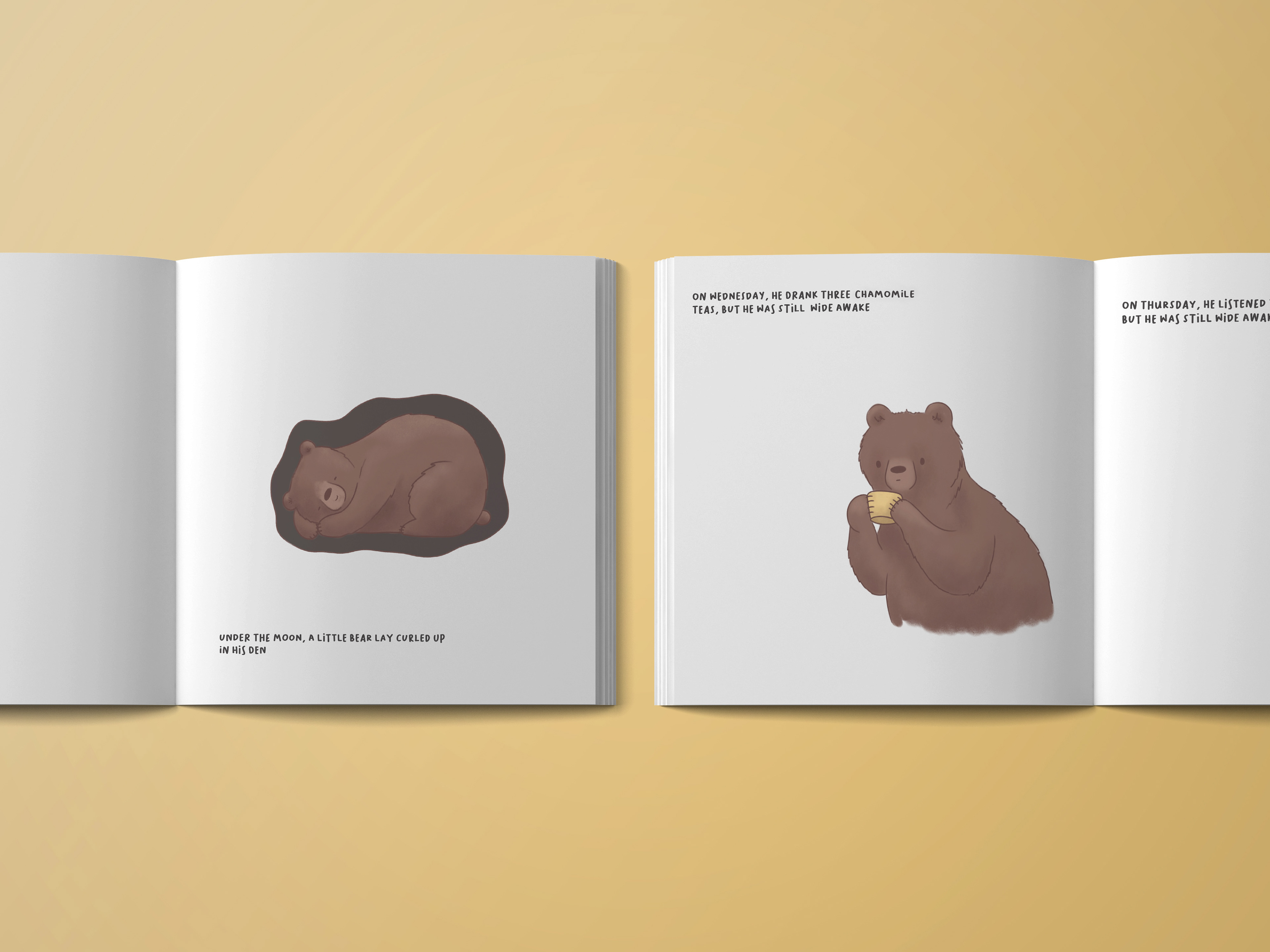 A project completed for a third year illustration elective. "The Very Awake Bear" was strongly influenced by "The Very Hungry Caterpillar" by Eric Carle. The story rewritten and illustrated by myself follows a bear preparing for his next hibernation